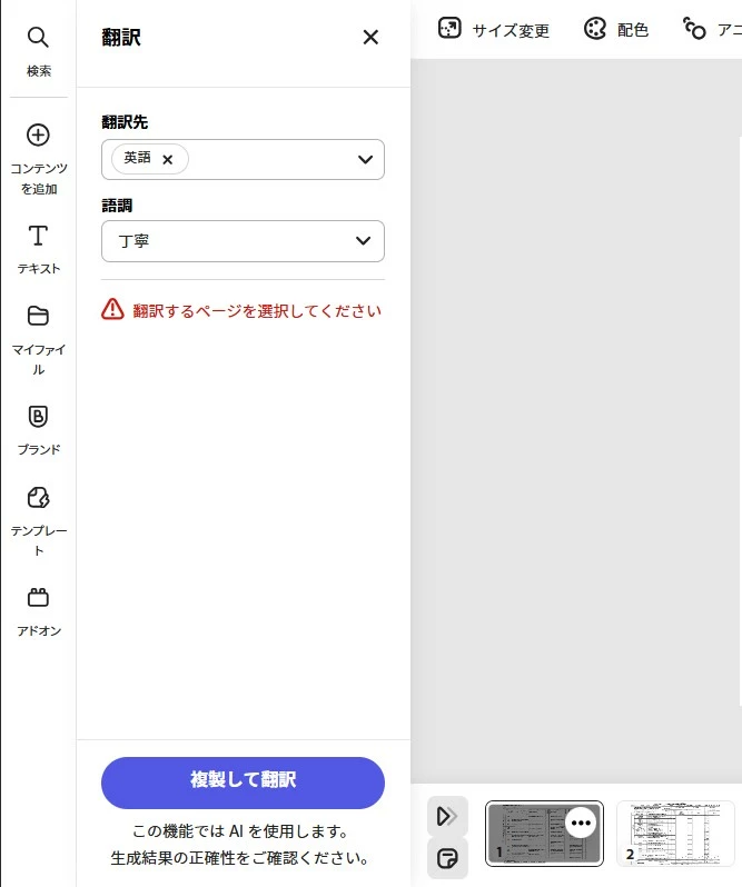 表題の件につきまして、既存のPDFファイル(日本語文書)をアップロードして翻訳のタブを選択。