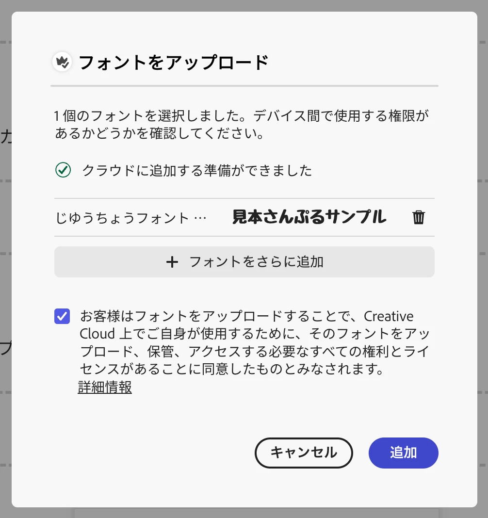 フォントのアップロードはCCサブスクリプションに紐づく為、契約形態によってはフォントのアップロードは出来ないです。AdobeExpressのみのプランではプレミアムプランが必要となります。