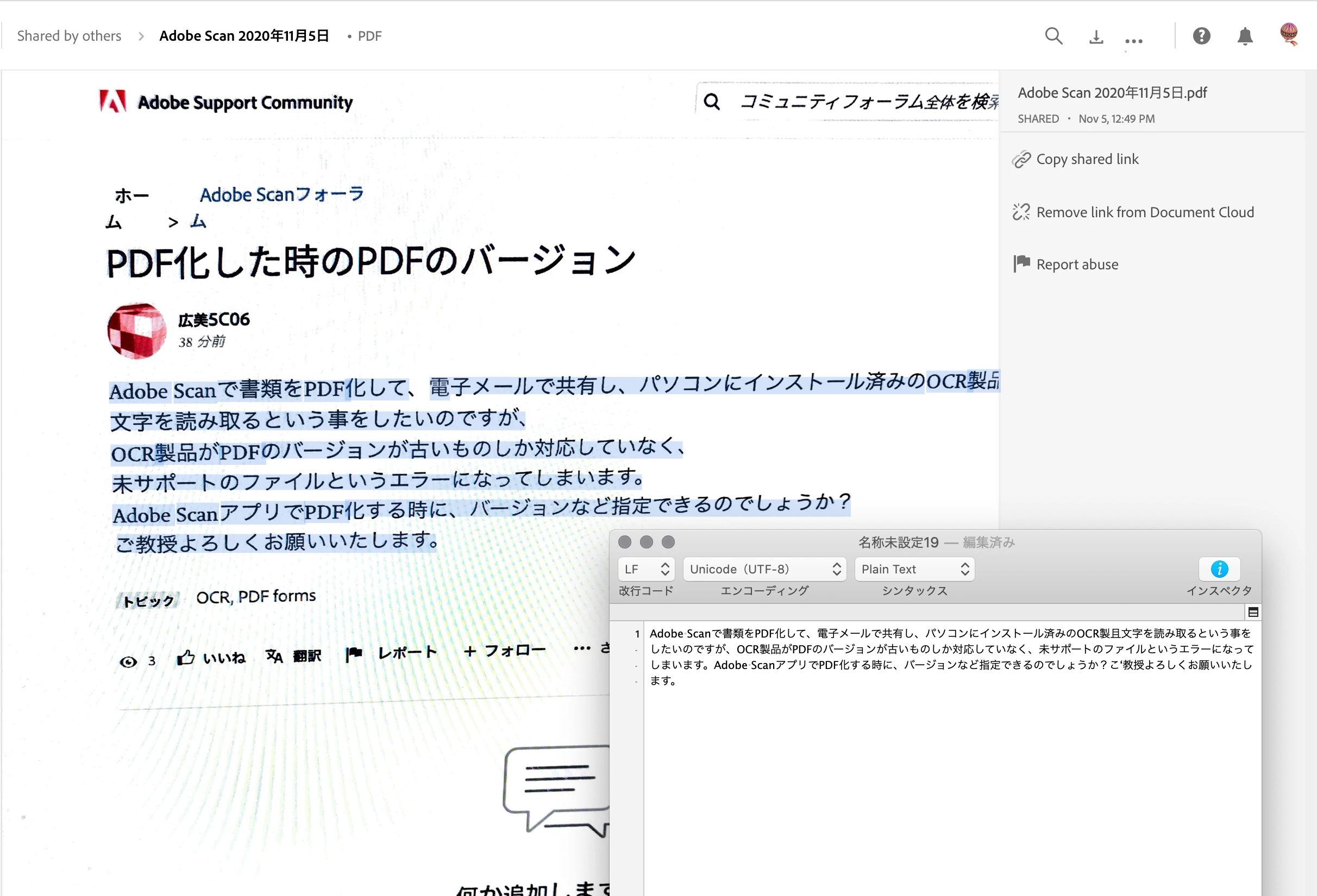 Adobe Scanで書類をPDF化して、電子メールで共有し、パソコンにインストール済みのOCR製品で、文字を読み取るという事をしたいのですが、