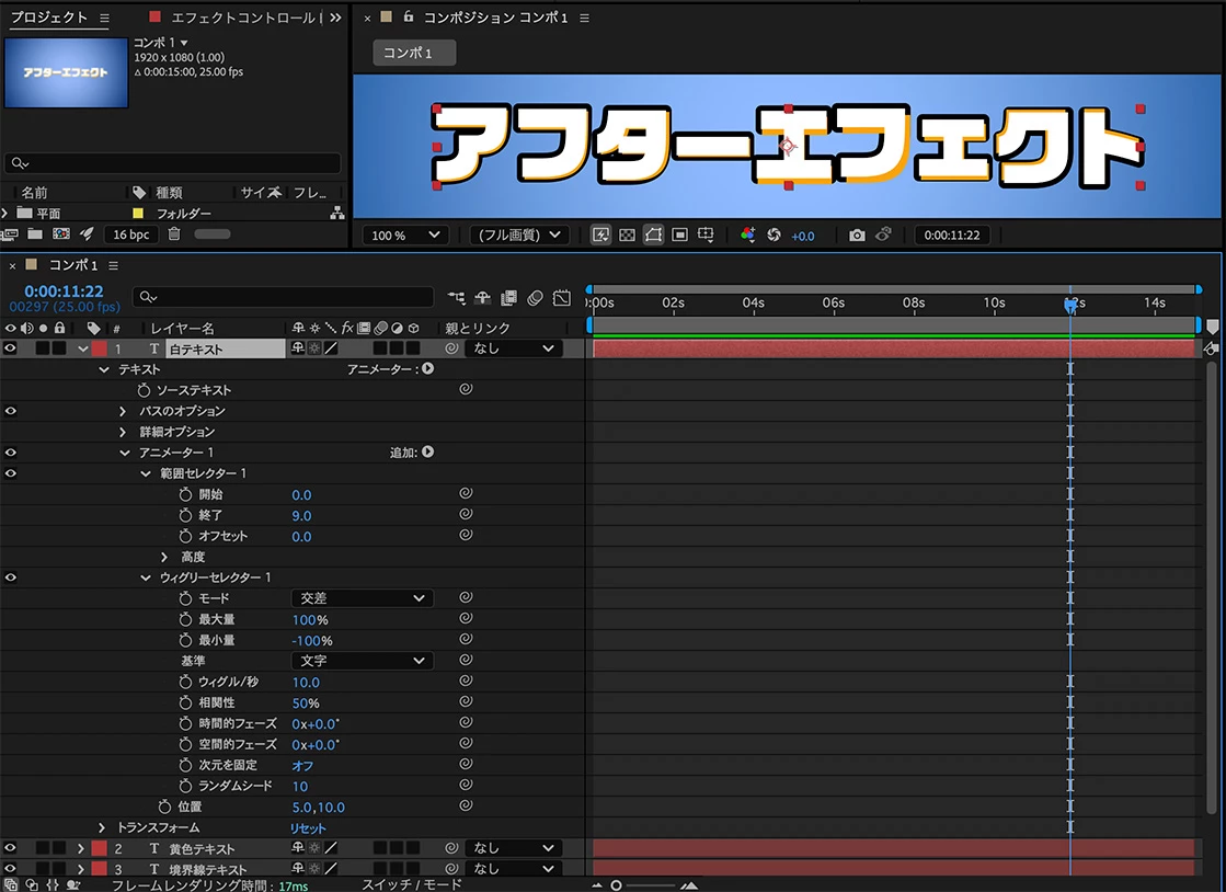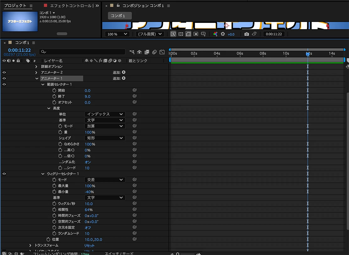 テキストレイヤーのアニメーター「位置」を追加してセレクターの「ウィグリー」も使用する方法と
