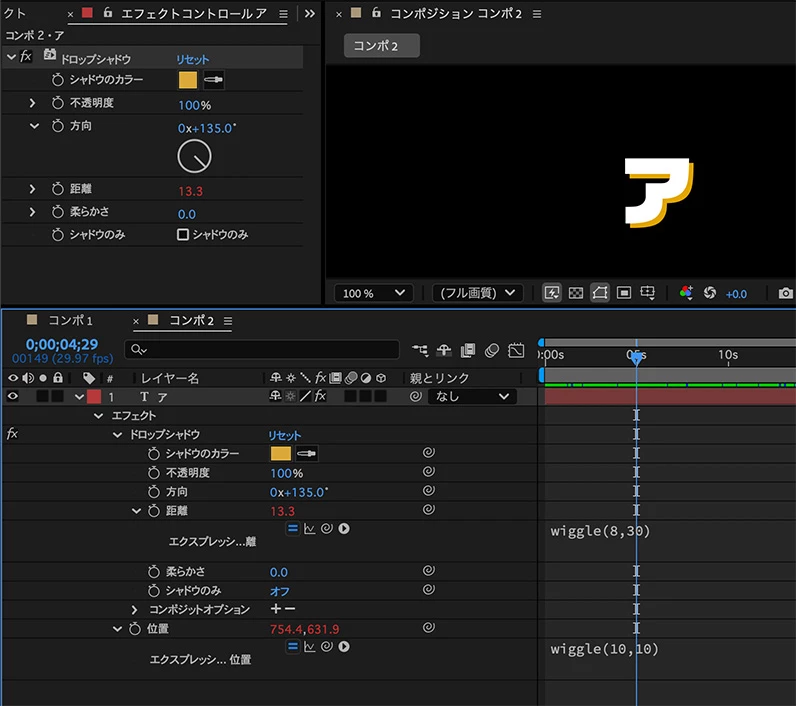 こちらは、ドロップシャドウを wiggle() で調整しています。