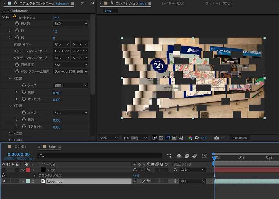 例えば、「フラクタルノイズ」と「カードワイプ」を使用した場合。