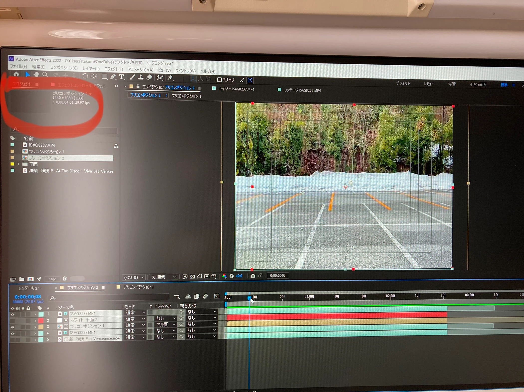 ちなみにプリコンポジション2は映像を載せているため、写真の左上のプロジェクトのサムネみたいなところは何かしら映るとは思うのですが映らなくなっています。たぶんこれが関係してるとは思うのですが、、