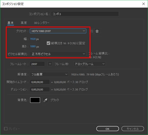 この時、プリセットを使用すれば、「幅」、「高さ」と「ピクセル縦横比」は自動的に設定されます。手動設定では「幅」、「高さ」と「ピクセル縦横比」は自分で設定します(下図赤枠部)。