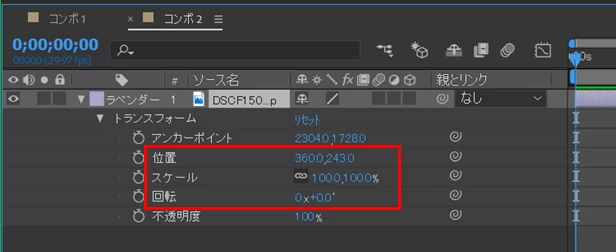 写真または画像の最適な画角を得るには、「タイムライン」パネルで写真または画像レイヤーを展開して「トランスフォーム」を開き、「位置」パラメーターで位置の移動、「スケール」パラメーターで拡大縮小、「回転」パラメーターで回転を行います(下図赤枠部)。