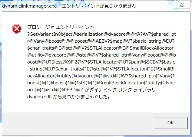 「プロシージャエントリポイントーーーーdvacore.dllから見つかりませんでした。」(添付)