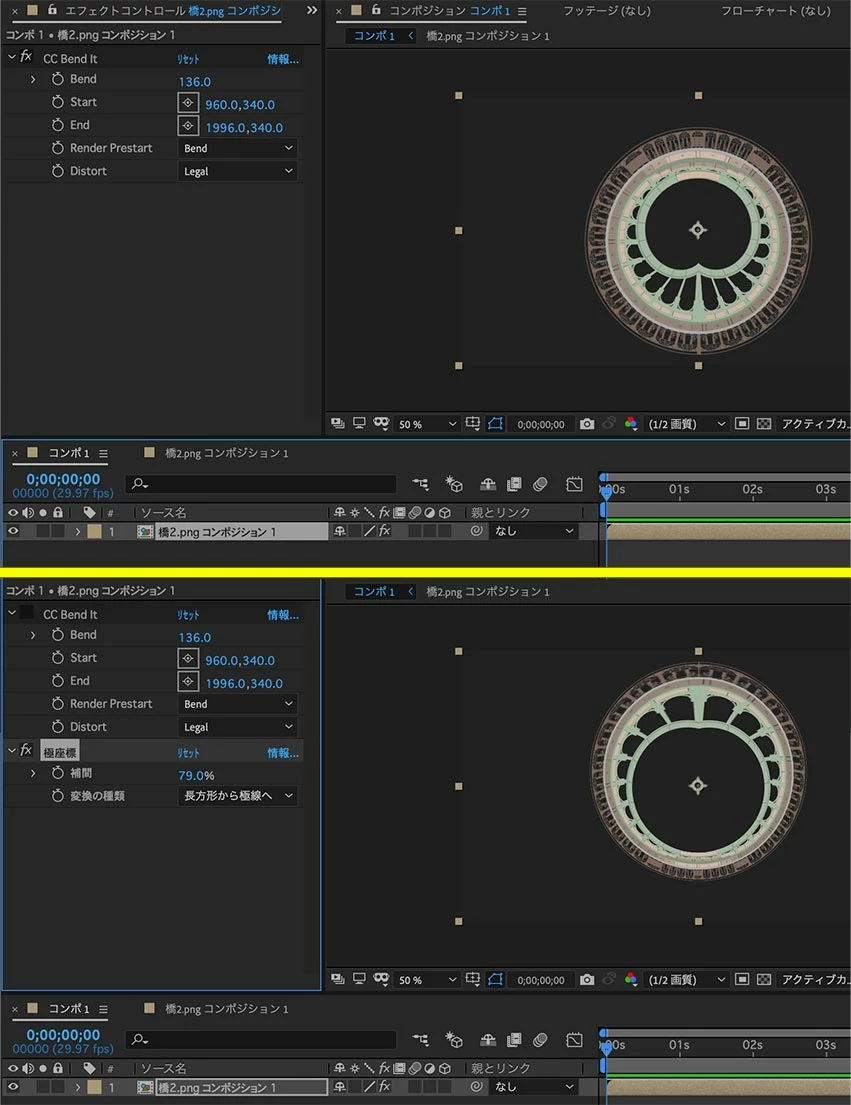 エフェクトの「CC Bend it」「極座標」で円に変形できます。