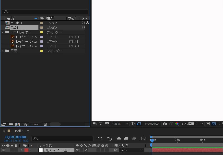 その後アフターエフェクトにてロゴにアニメーションを加えようと思いレイヤー分けしたデータをプロジェクトに置きました