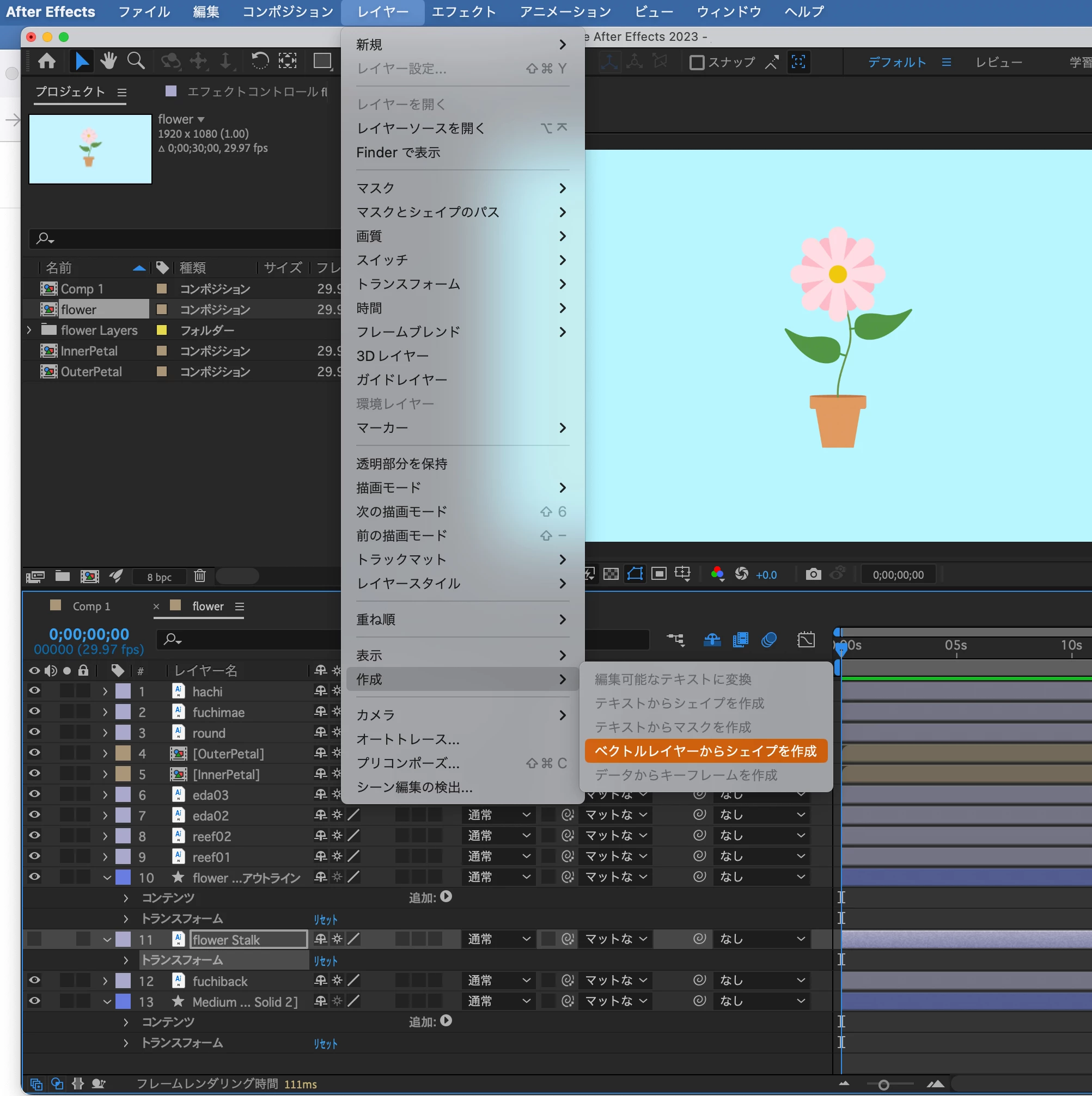 イラレ→Ae読み込みは「コンポジション」「レイヤーサイズ」です。