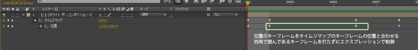 キーフレームは停止した状態なので、タイムリマップのキーフレームの総数に合うように、