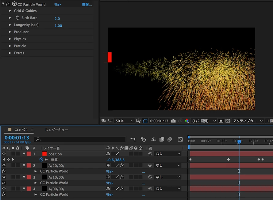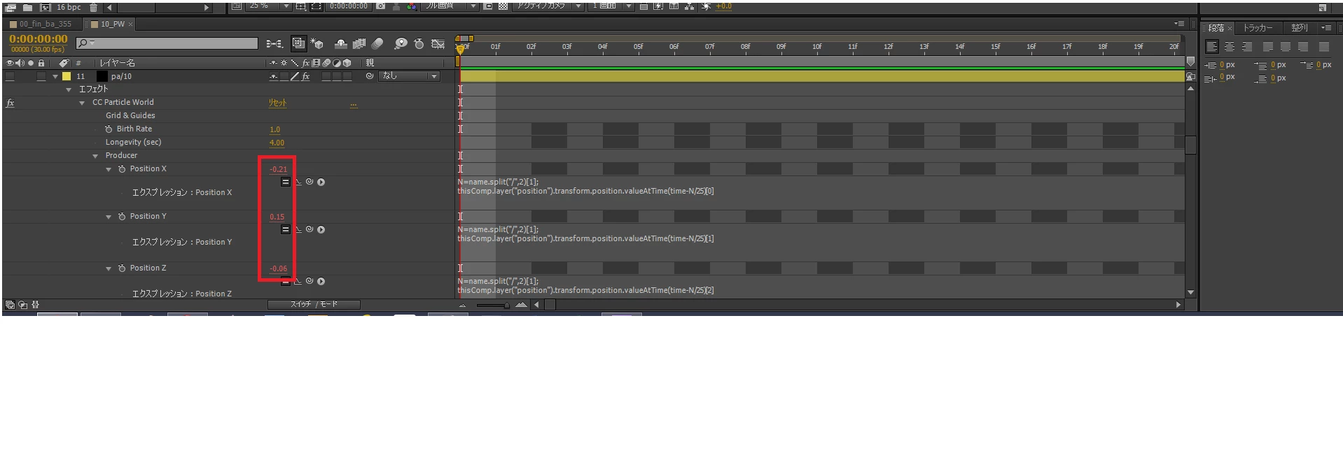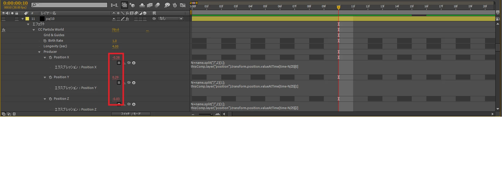 ある教材にCC particle worldのProducerのPositionXにエクスプレッションで