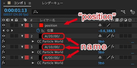 「0フレームでのレイヤー名"position"(ヌル)の数値の画像」