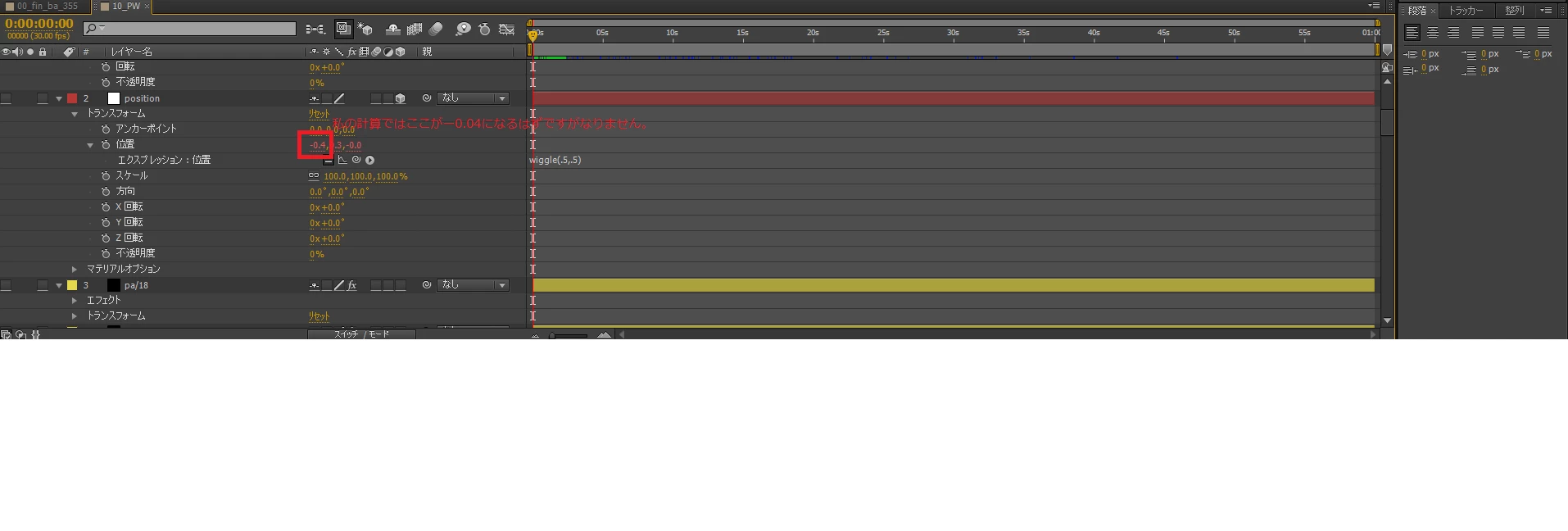 positionレイヤーの 0フレームの値が –0.4なので、PositionXの値は –0.4になります。