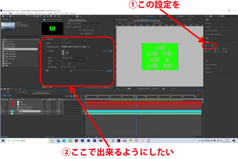 畑畑田(ハタダ)Participating FrequentlyForum|Forum|4 years agoApril 17, 2021Questionエッセンシャルグラフィックスでテキストの「段落」設定のやり方についてForum|Forum|4 years agoApril 17, 20211 reply367 viewsAfterEffectsで汎用的に使えるテロップのテンプレート(エッセンシャルグラフィックス)を作成しようとしています。テキストレイヤーに指定した複数行の文字列の下記の項目も指定できる様にしたいのですが、やり方が解りません■段落パネル ・「テキストの左揃え」 ・「テキストの中央揃え」 ・「テキストの右揃え」 どなたかご教示いただければ幸いです。 OS:Windows10AEバージョン:18.1.0(Build38)