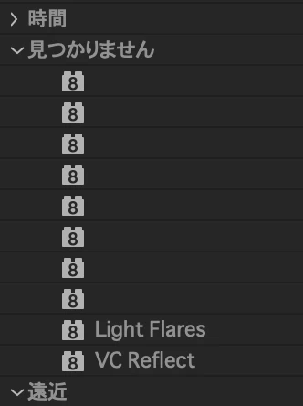 エフェクト&プリセットの中にある1つのフォルダー名が「見つかりません」となっています。