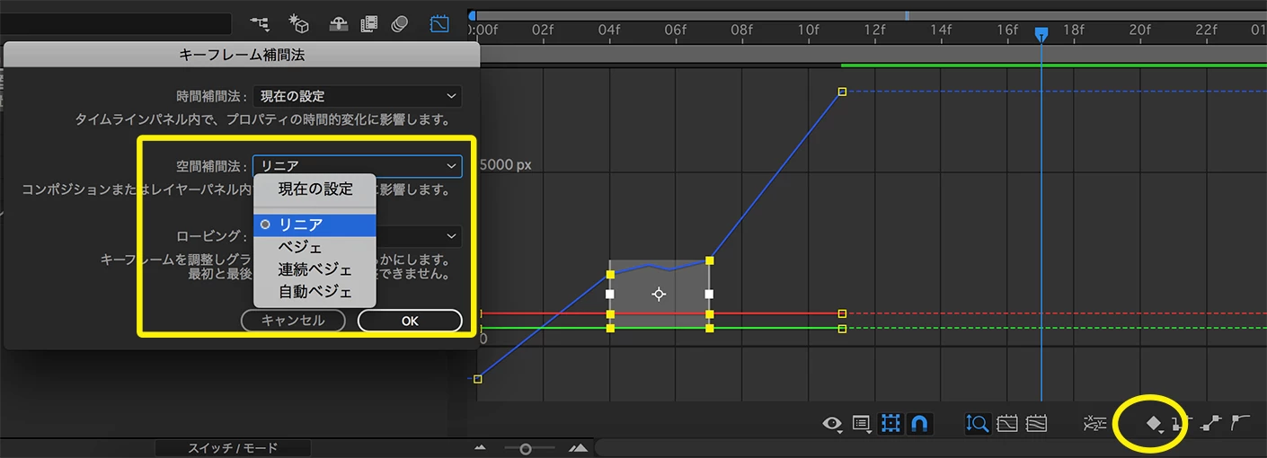 キーフレームを選択して、下図の黄丸をクリックすると、補間法のウィンドウが開くので、「リニア」に変換してください。