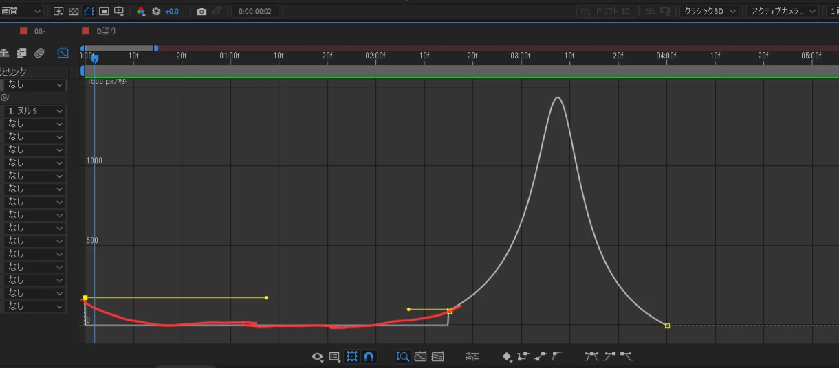 グラフエディターを使用し、赤い線のように滑らかな感じにしたいのですが、黄色い線を引っ張ってもキーフレームの点が動いてしまうだけで写真のようにカクカクしてしまいます。