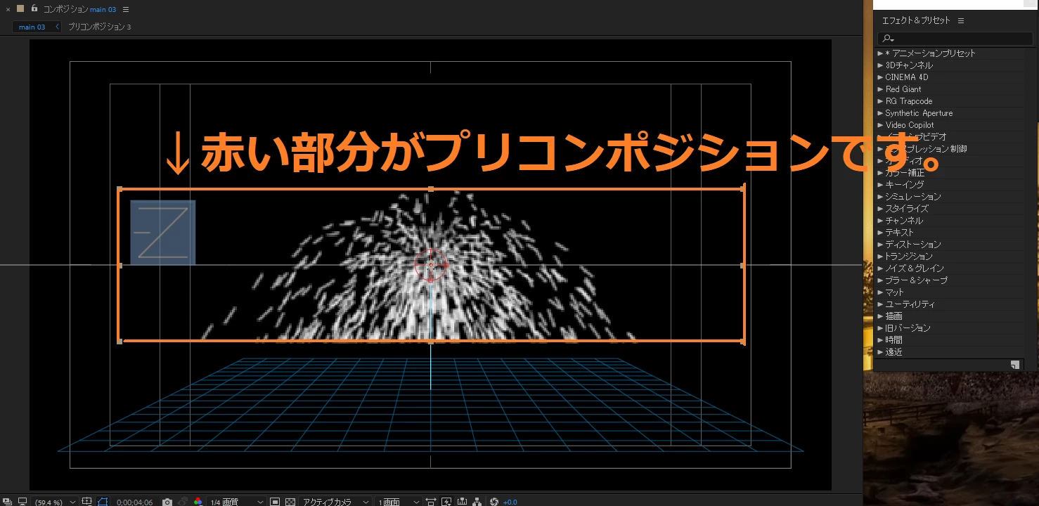 プリコンポジションの外までパーティクルが表示される方法を忘れてしまったので、知っている方教えてください。