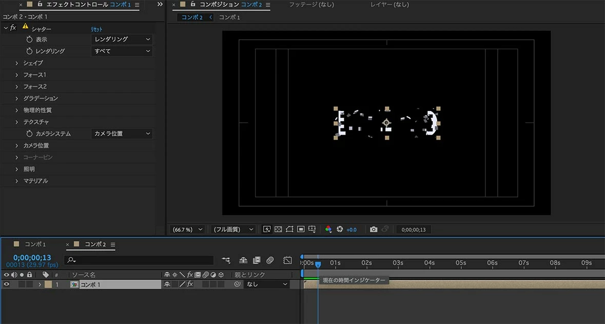 プリコンポジションの外までパーティクルが表示される方法を忘れてしまったので、知っている方教えてください。