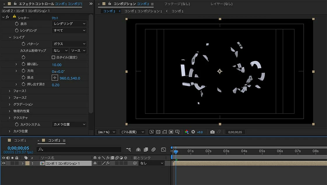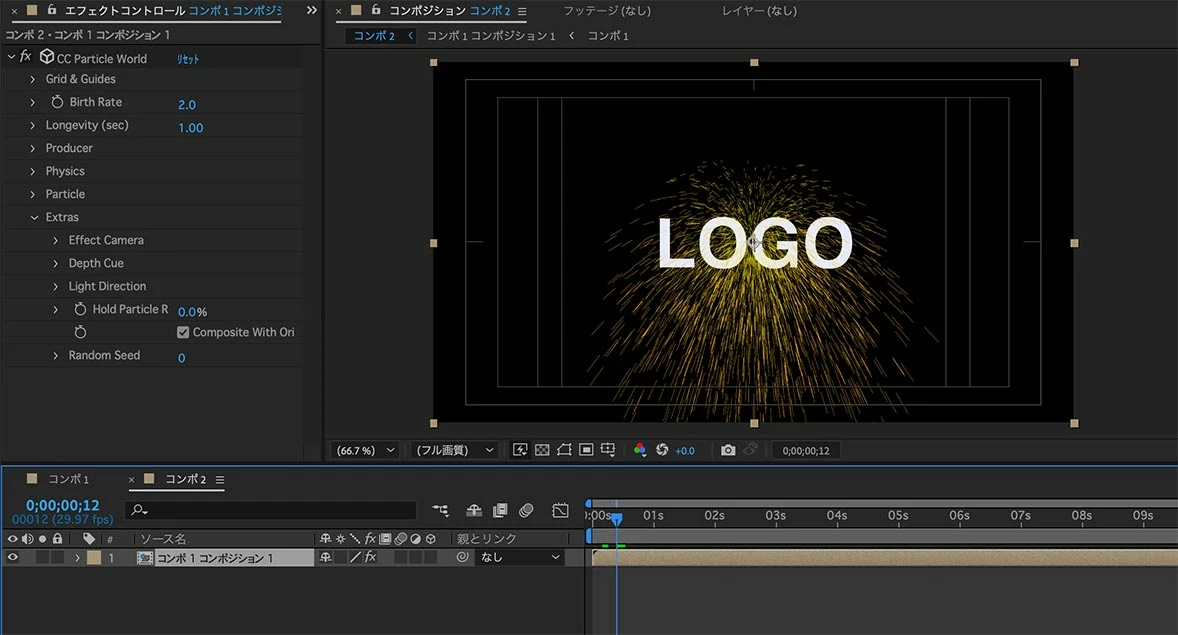 プリコンポジションの外までパーティクルを飛ばすことが出来ていました。