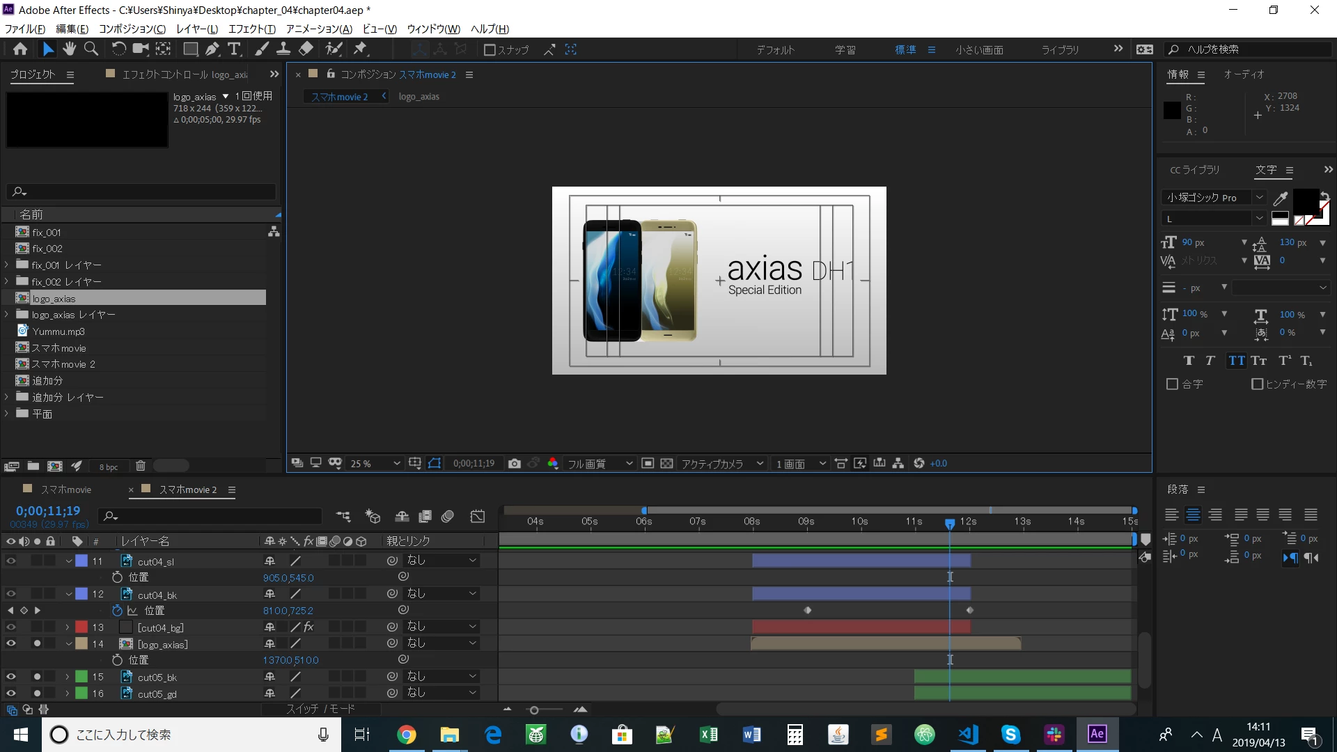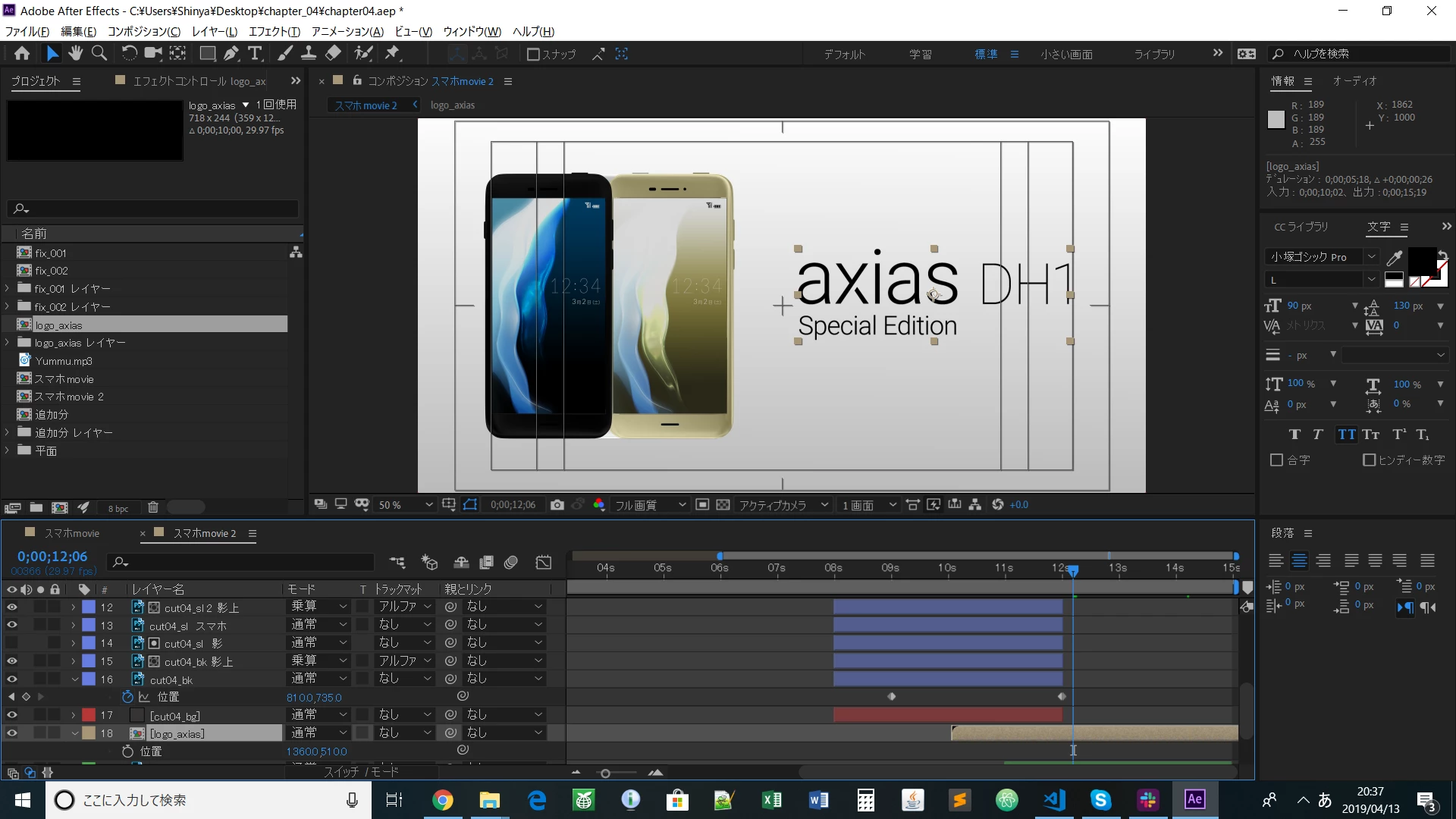 「logo_axias」を開いて各レイヤーの長さを伸ばすと表示されると思います。」