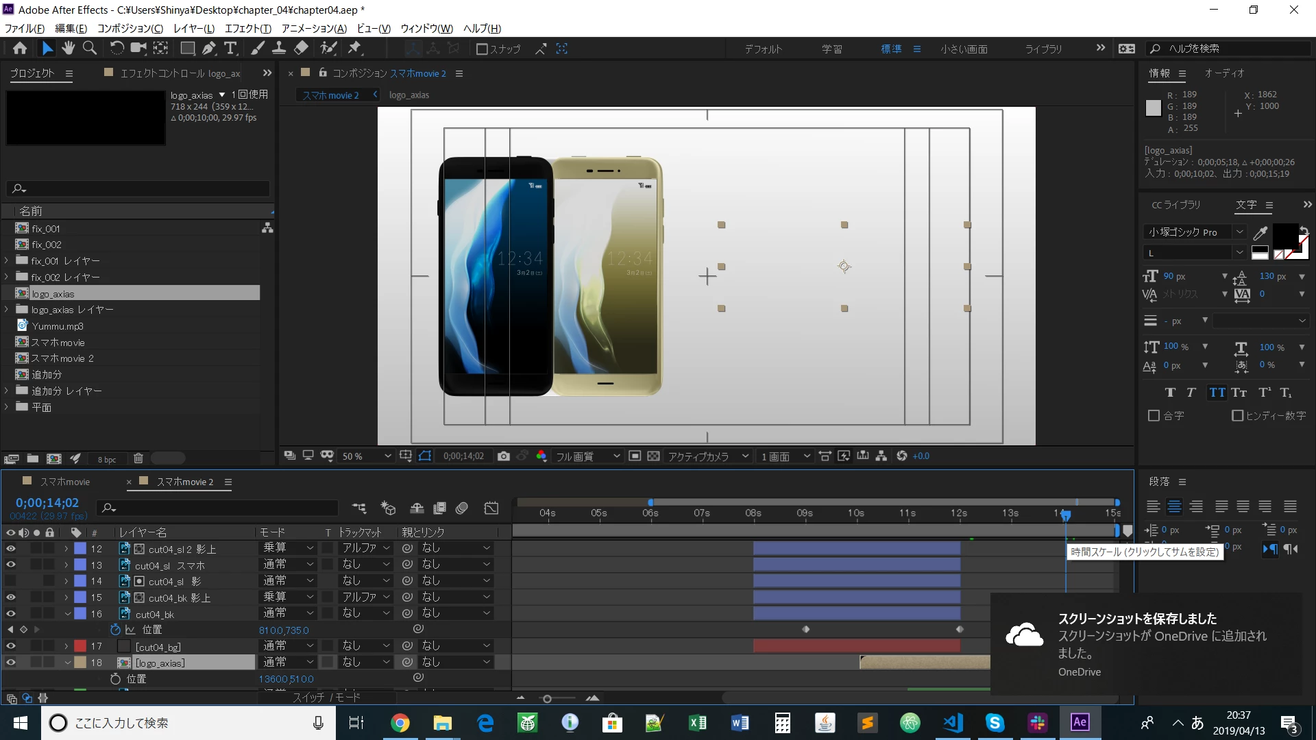 「イラレファイルを読み込んで作成したコンポ「logo_axais」のデュレーションを変更した後に