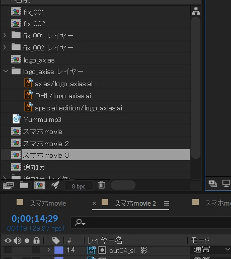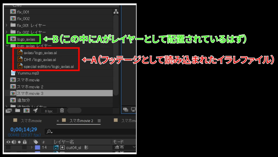 なので、Bのlogo_axiasコンポを開いて(ダブルクリックして)、