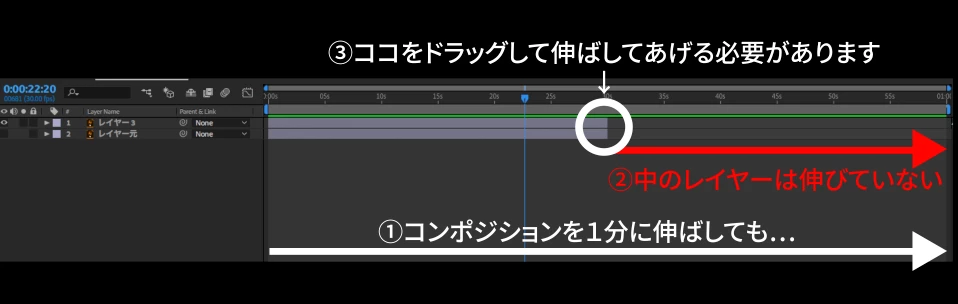 コンポジションにレイヤーとして配置された時にデュレーションが確定されます。