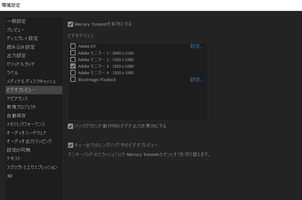 環境設定のビデオプレビューから該当のモニター、今回はプロジェクターにチェックを入れてみてください。