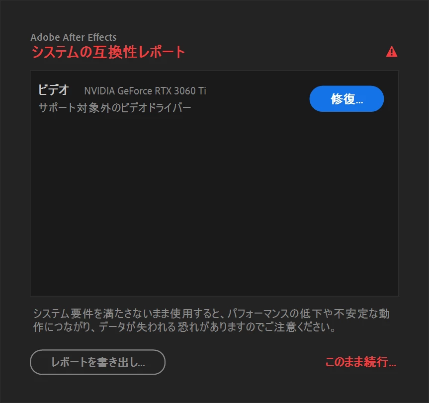アフターエフェクトv24.5をダウンロードしたのですが、添付画像の表示が出現します。対処方法ありますか?