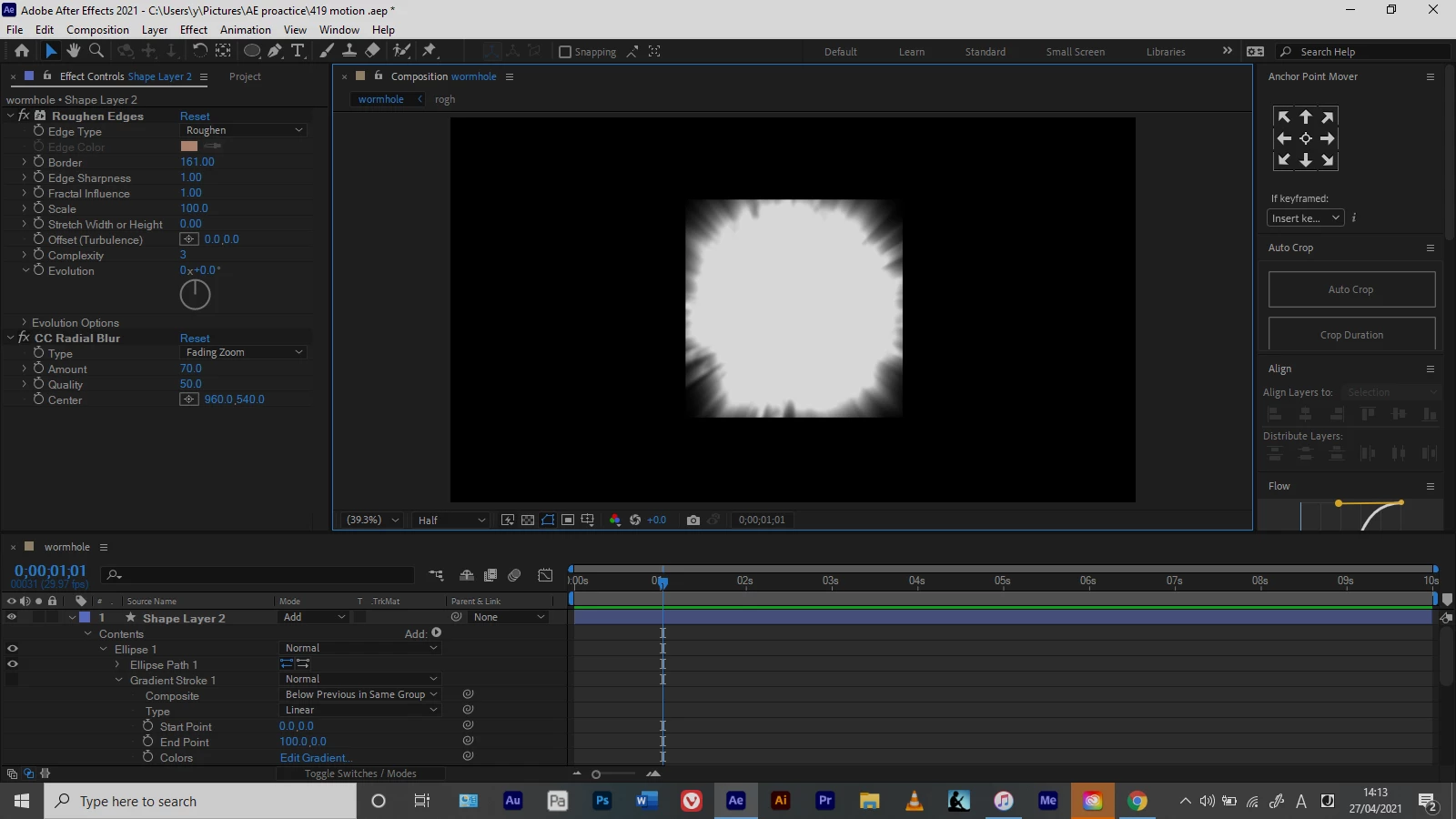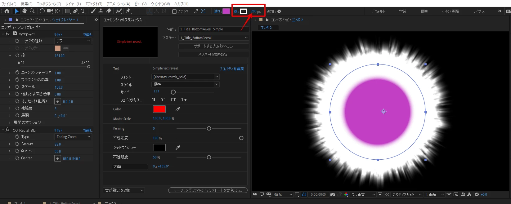 このシェイプレイヤーにエフェクトを適応して、写真二のようなまぶしい光源を作ろうとしています。