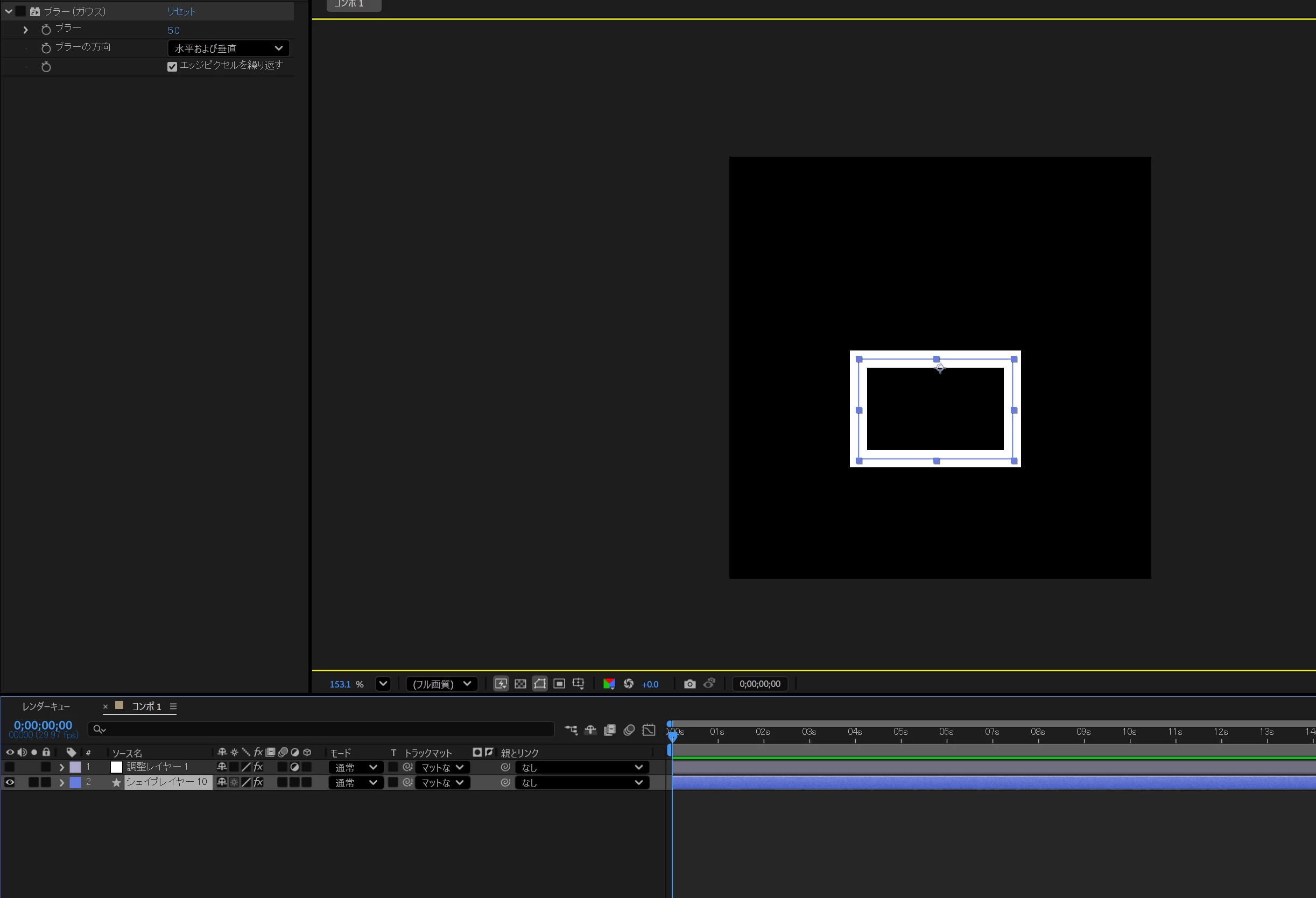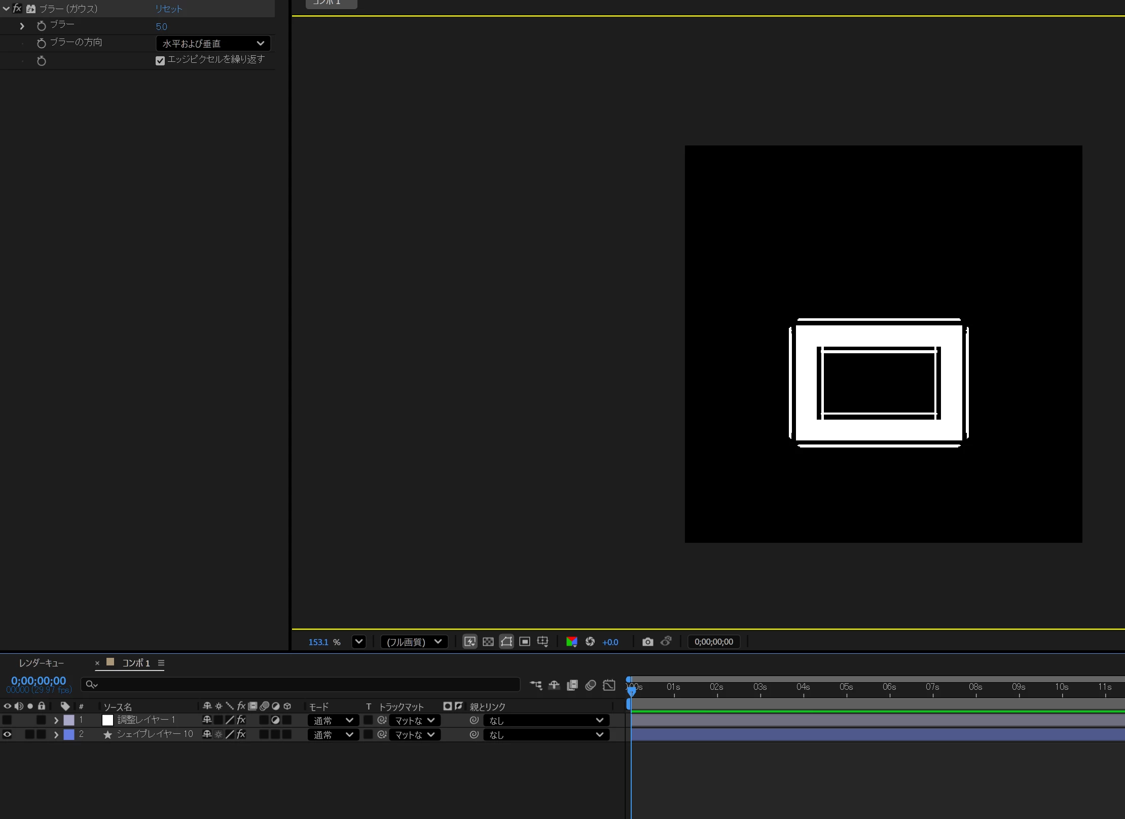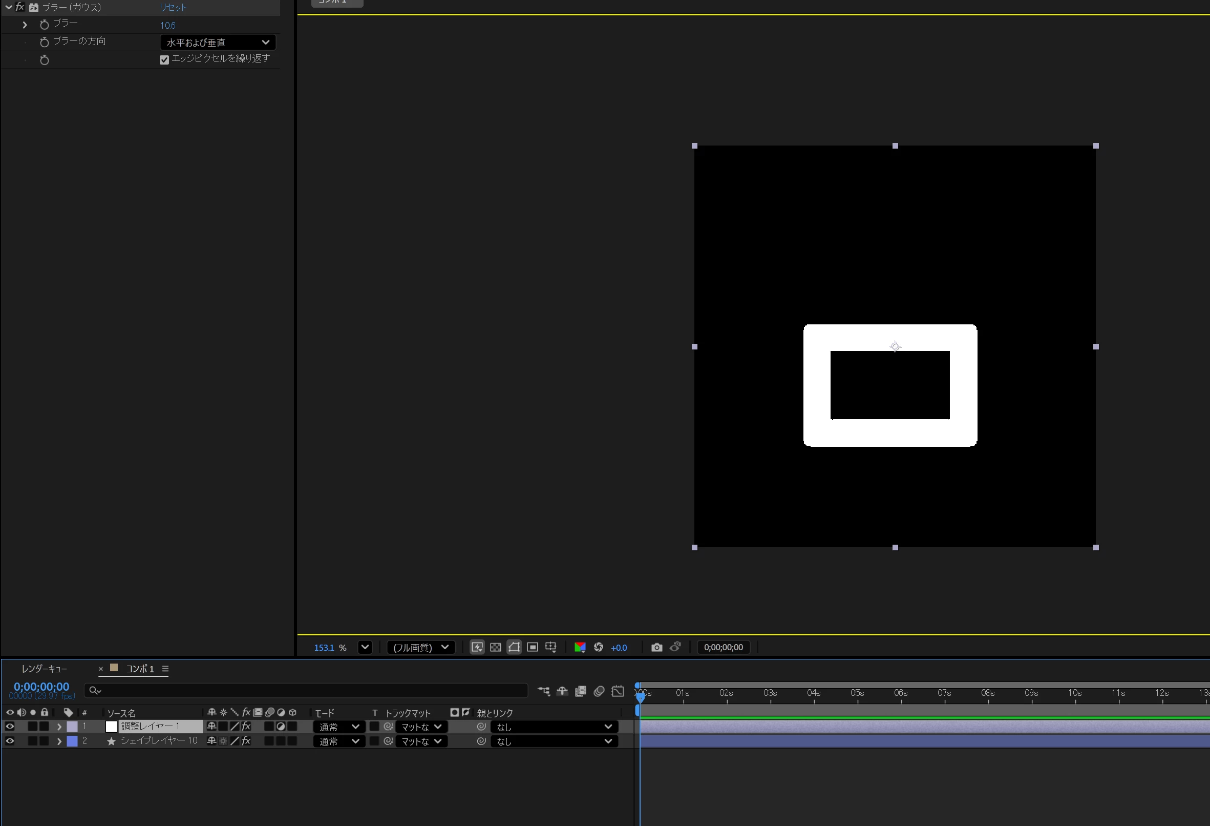 表示をRGBストレートにし、アルファがある半透明の領域を表示し、四角い線のシェイプレイヤーにブラーをかけています