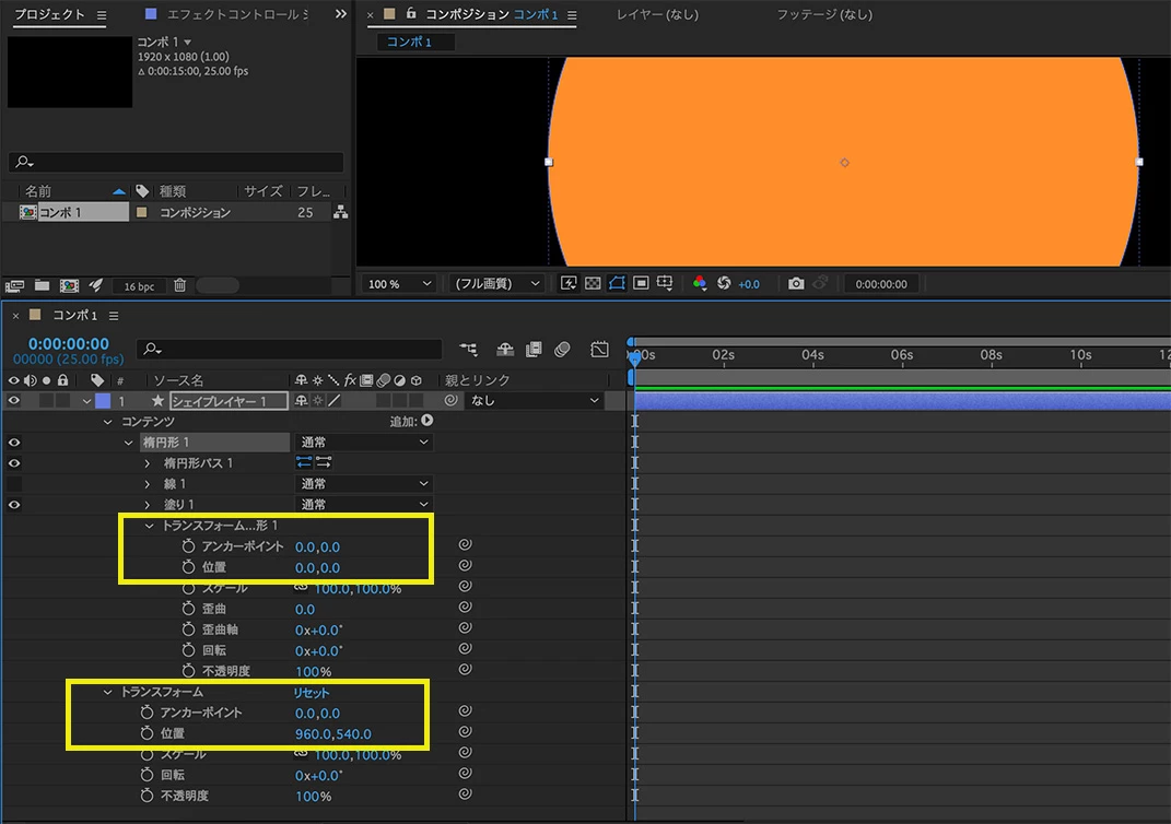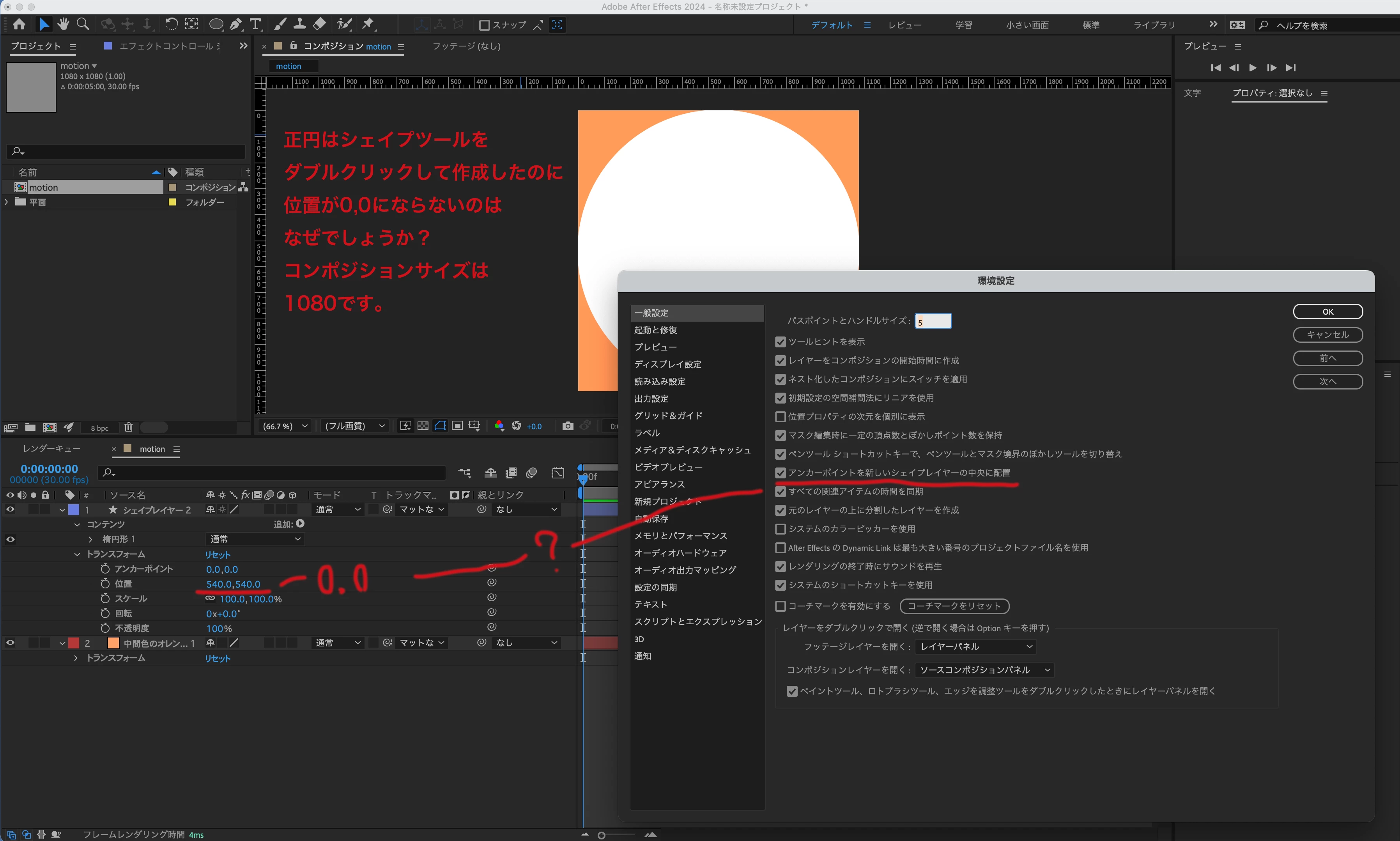 レイヤーの位置は、540,540となりますが、シェイプについては中央が0,0の座標になる為、もし、下図のプロパティが0,0にならない場合は、初期化などの対処が必要だと思います。