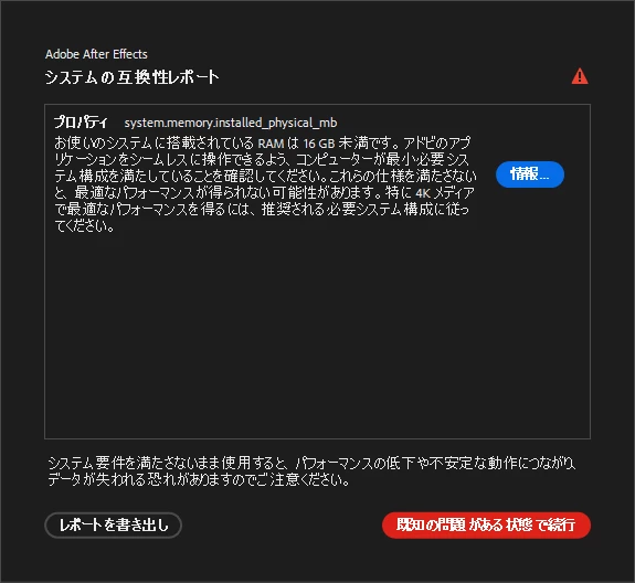 今朝AEを開いたところ、以下のレポートがでるようになってしまいました。