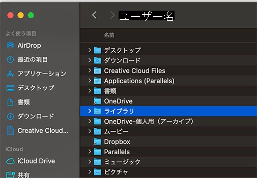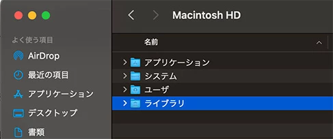 Finderの「移動」メニューでライブラリを開くと、この場所になります。