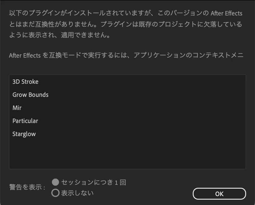 ”以下のプラグインがインストールされていますが、このバージョンのaftereffectsとはまだ互換性が