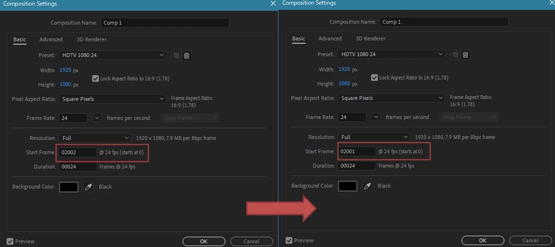 そのため、コンポジション設定の開始フレームが想定した値と異なります