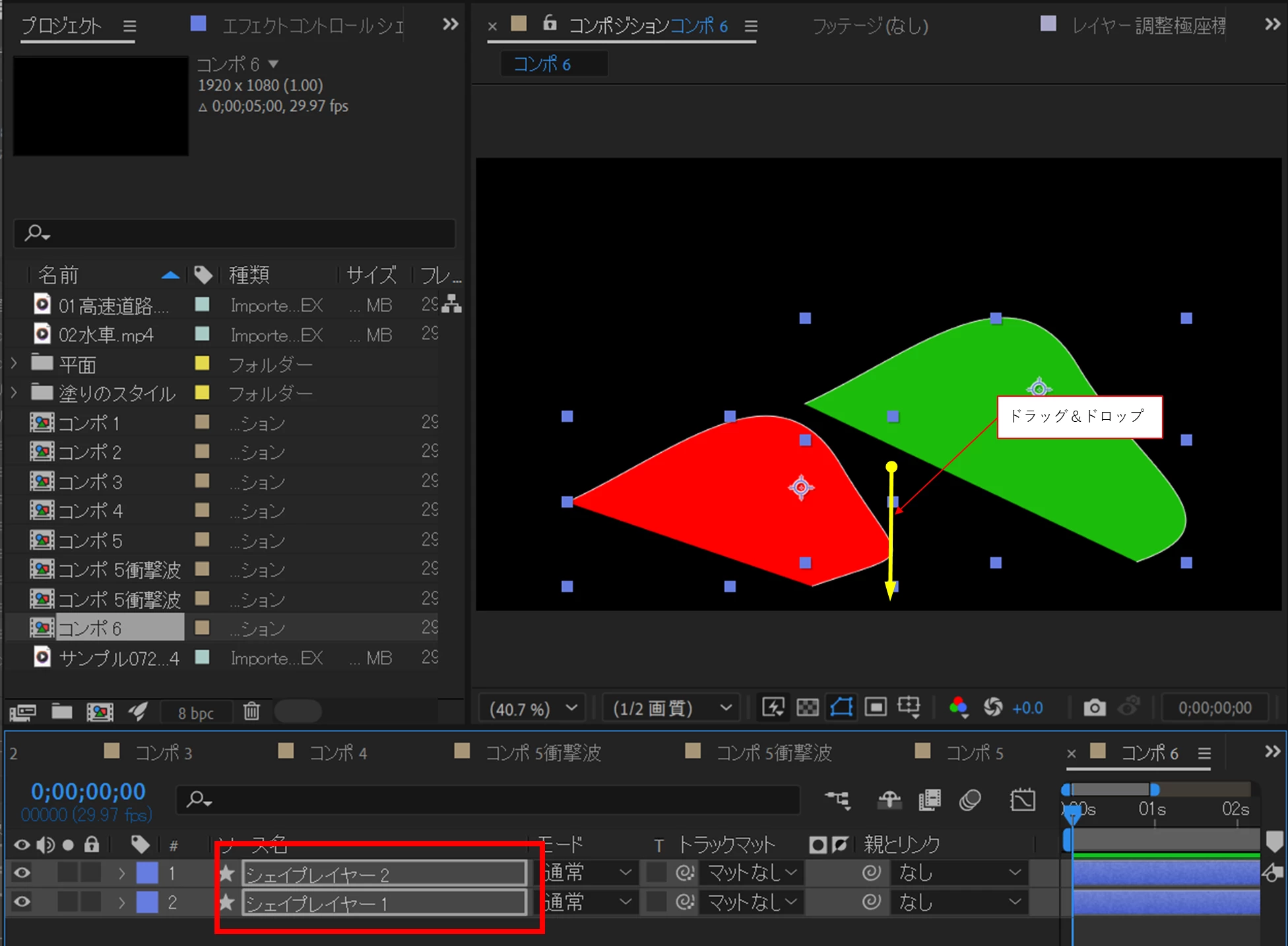 シェイプレイヤー1,2をスナップさせ画面下部に移動させようとしたのですが、ドラッグしている2しか移動せず1は元の位置に残ったままです。
