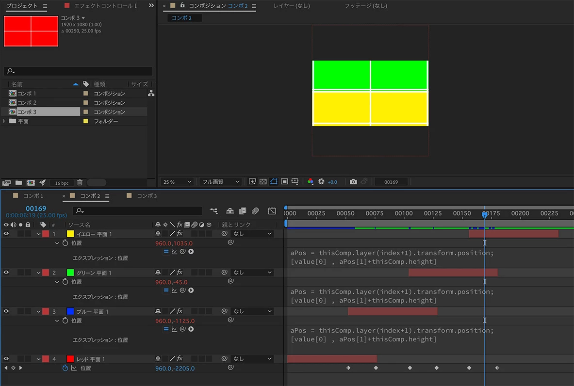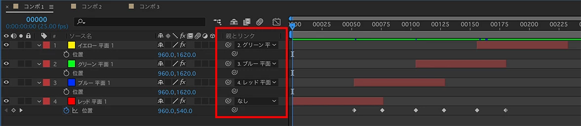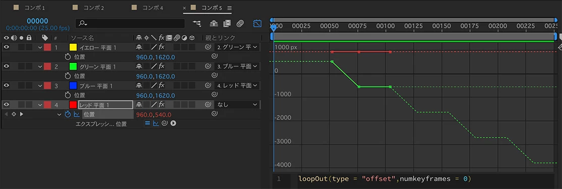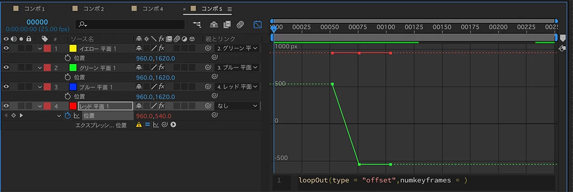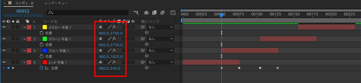 下から2番目以降のレイヤーの位置に下記のエクスプレッションを追加します。