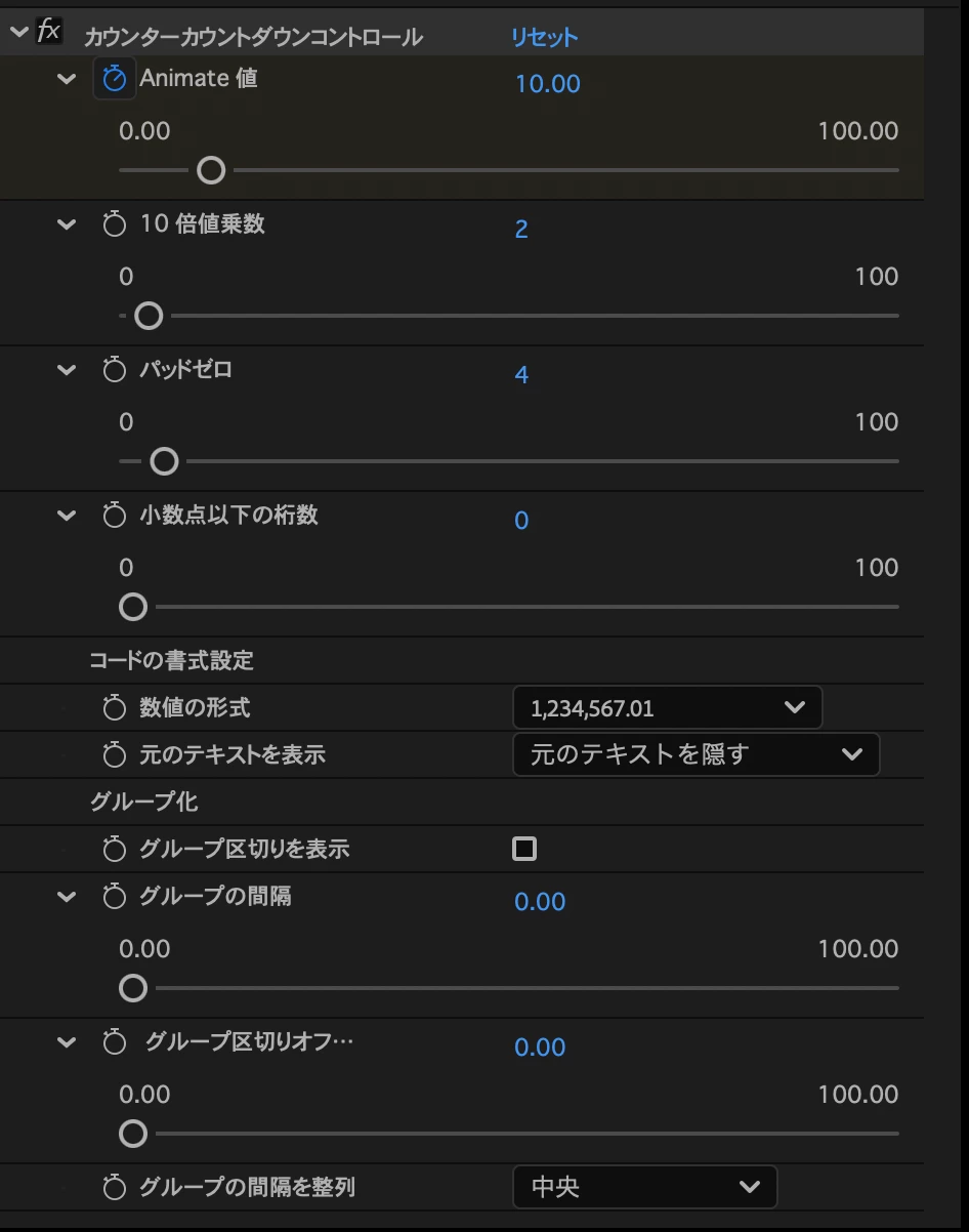 また、After Effectsフォーラムの「カウントダウン。1の位と10の位の位置を固定させたい。」という質問ページに「番号エフェクトのプロポーショナルを無効化」で解決されたとあったので試しましたが、番号エフェクトを適用すると、あらかじめ用意しておいたテキストが非表示になり、「0.000」というテキストに置き換わってしまい、解決できませんでした。
