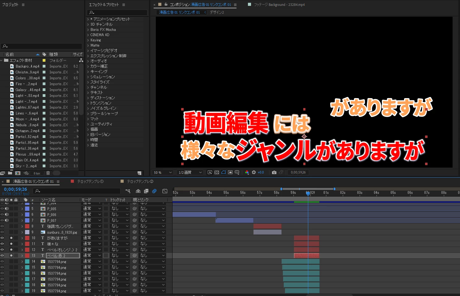 ①「動画編集には様々なジャンルがありますが」というテキストレイヤーを作り、別のレイヤースタイルを用いて「には」「様々な」「がありますが」を作りました。最初に作ったテキストレイヤーからこの三つの部分を入れ替えたいと考えています。しかし下段の「がありますが」を消すと「ジャンル」も動いてしまいます。この場合どうすればいいでしょうか?もしくは他に何かいい方法がありますでしょうか?