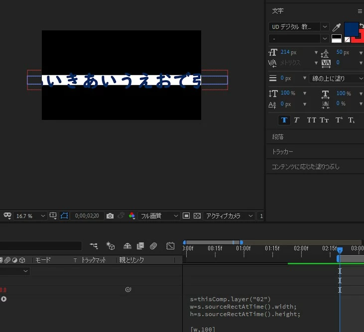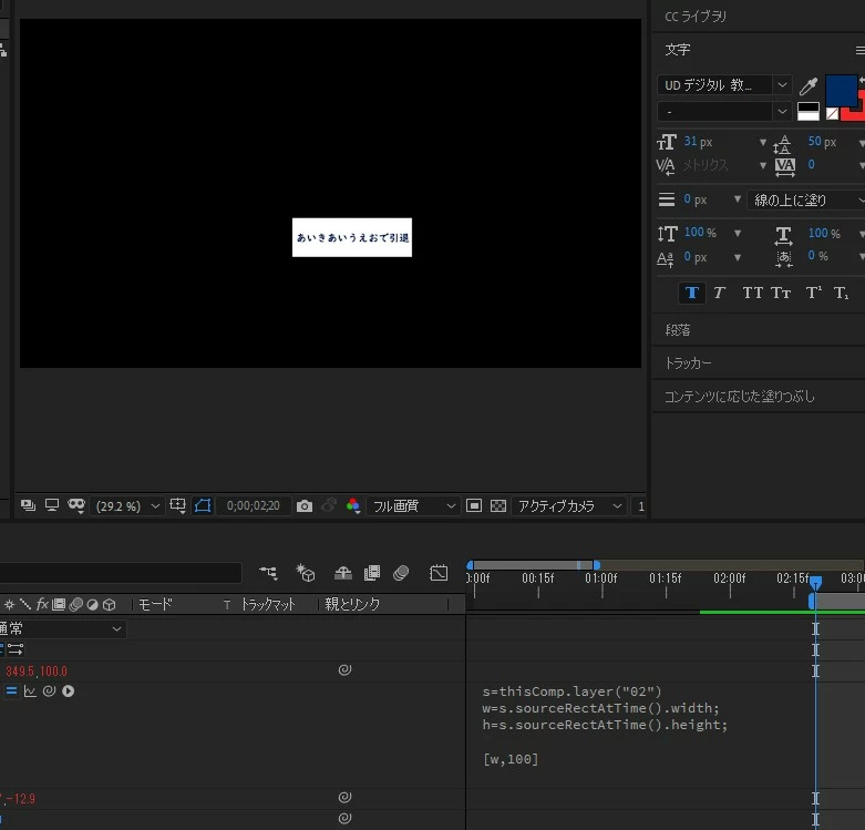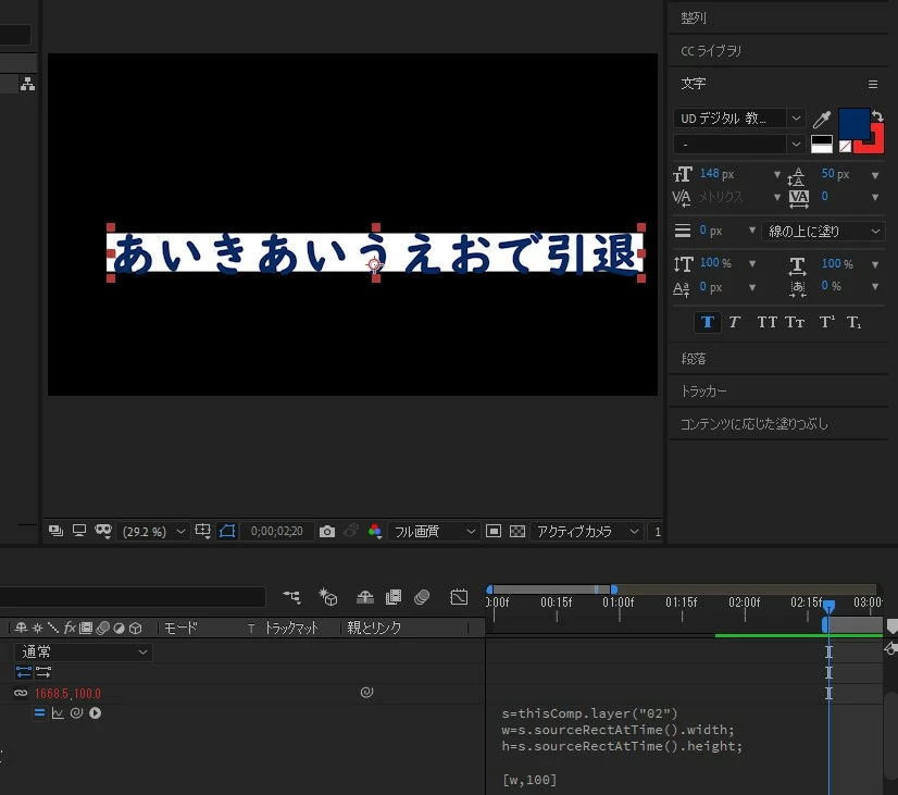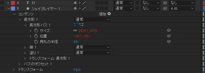 これで、テキストに合わせて長方形レイヤーの横の長さも変わるようになっているのですが、