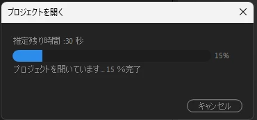 状況としては、「プロジェクトを開く」のウィンドウが出てきて「推定残り時間:30秒」「プロジェクトを開いています15%完了」から進まなくなってしまいます。