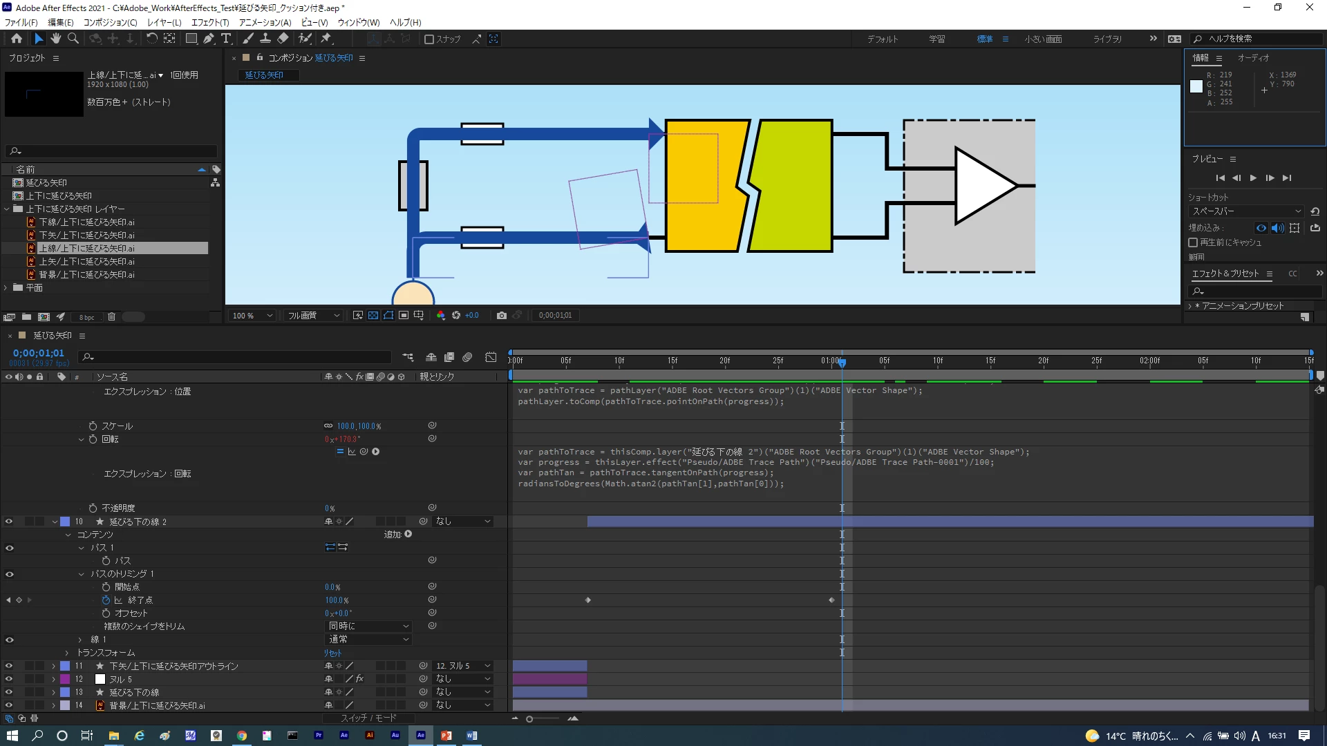 シャイプレイヤーのパスのトリミングの終了点にヌルレイヤーの進行状況を
