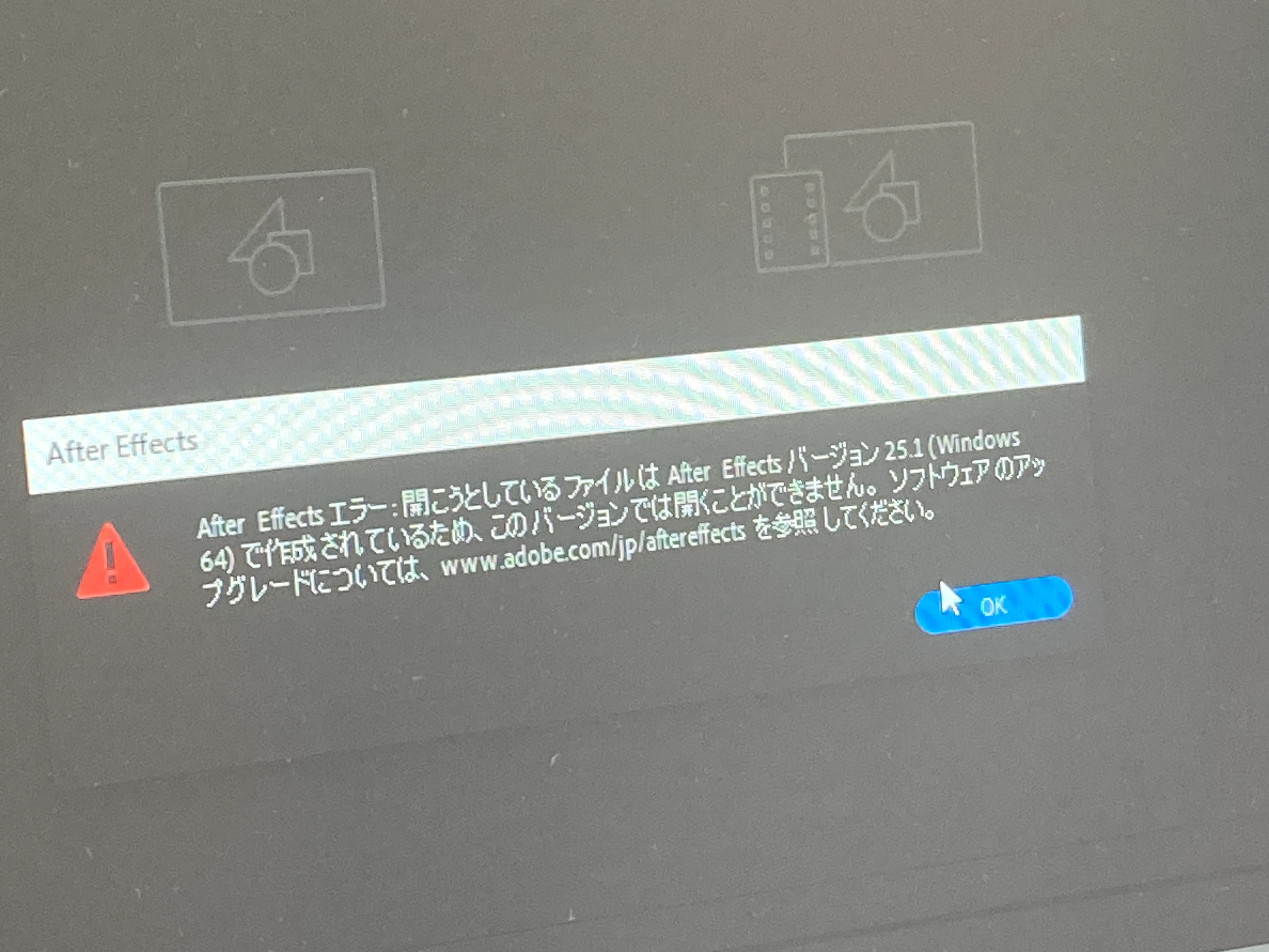 もう捨ててしまったパソコンのAeのデータを移行したので、今使用してるパソコンで編集したいのですが、この表示が出てしまい、バージョンも25.1にしたはずなのですが、どうしたらいいですか?