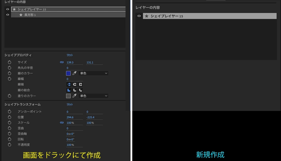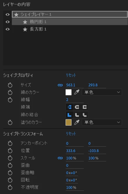 レイヤー>新規制作>シェイプレーヤーで制作するとレイヤー内容に「シェイプレイヤー」は表示され、その後に楕円・塗りなどを追加しても何も表示されないです。