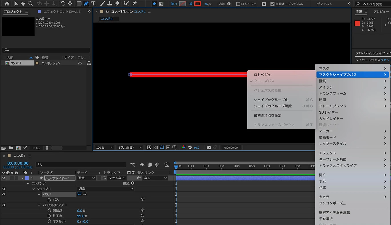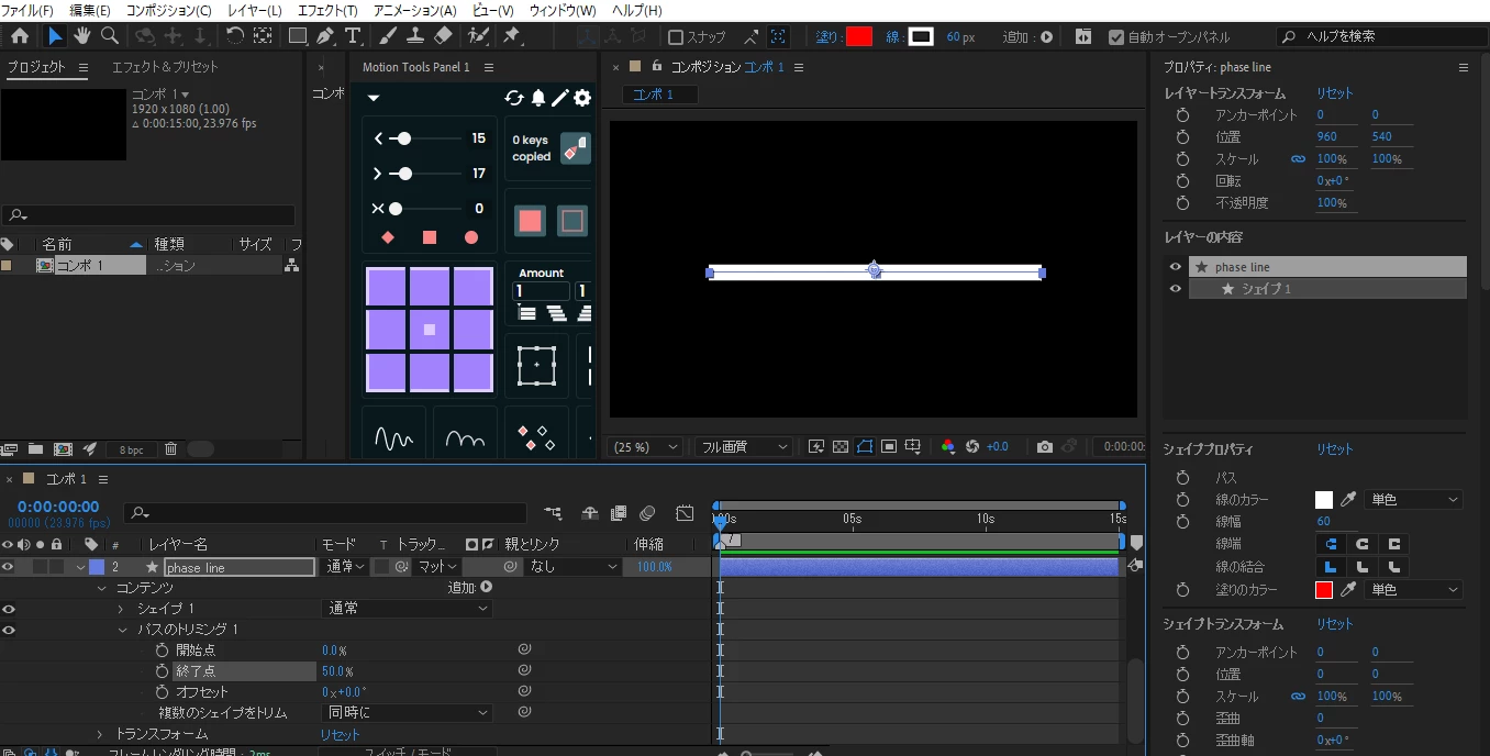 画像のようにパスのトリミングで終了点を50とすると、50%でシェイプの端から端へと到達してしまい、わかりにくく操作がしにくいです。