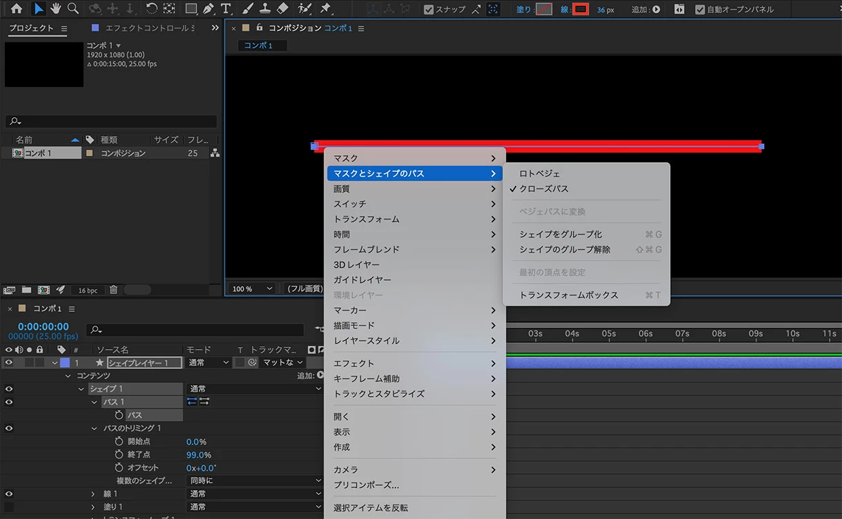 タイムラインの「パス」が選択されているか確認してから右クリックするとクローズパスを選択できます。
