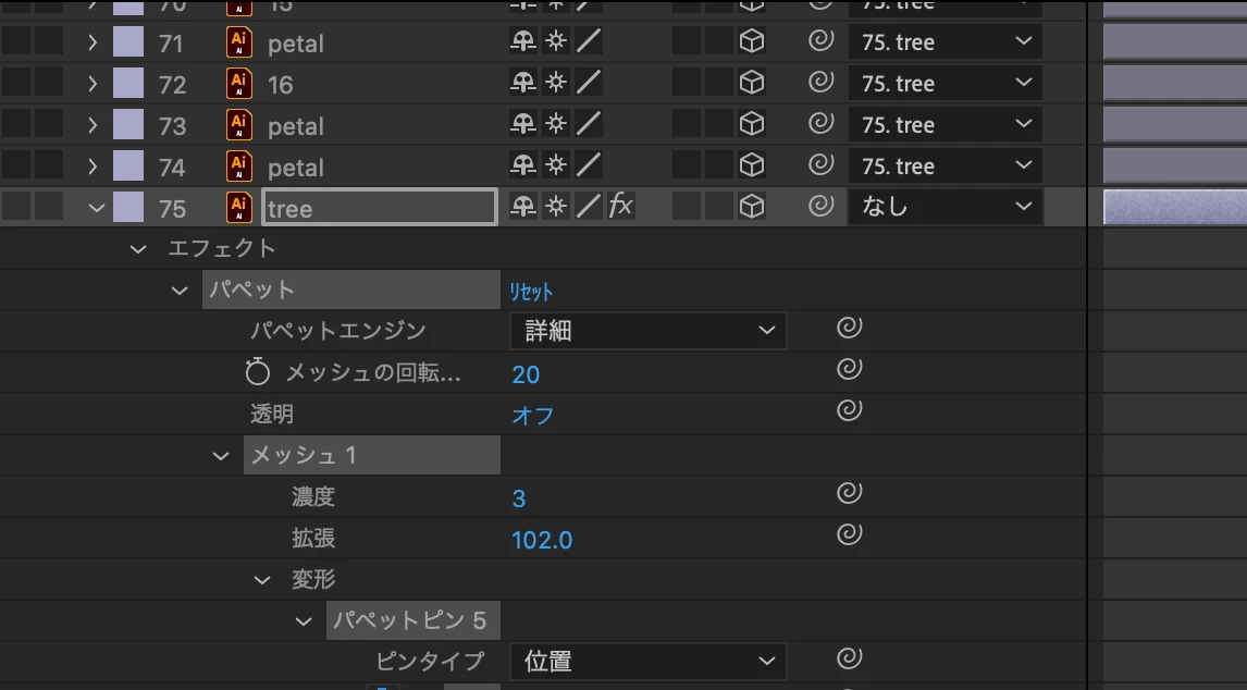 それを動かすと花びらは動かず木だけが動いてしまいます。