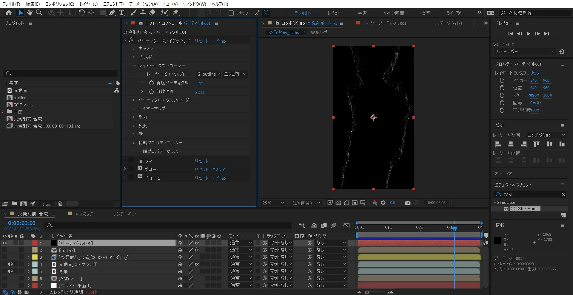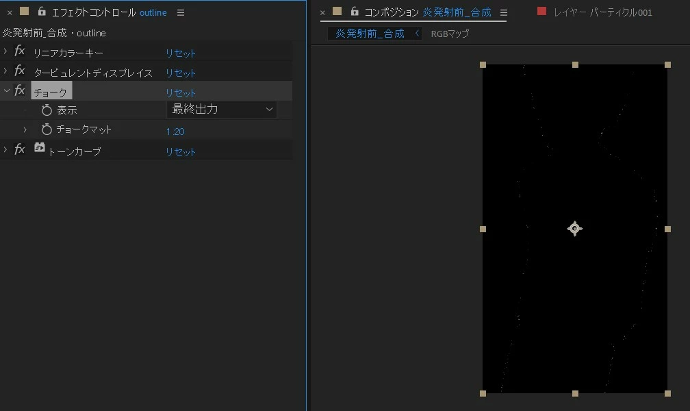 問題は動画の26:51~以降で決め打ちしたパーティクルを一旦PNGシーケンス(RGB+アルファ)として出力するところです。コンポジションパネルではパーティクルが表示されているにもかかわらず、出力結果は真っ黒(透明?)でパーティクルの無いPNGファイルが120枚程出力されるだけでした。